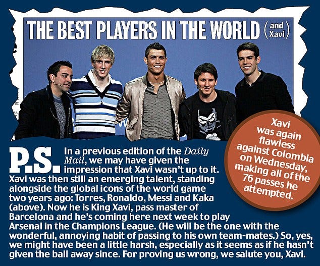 Let’s go back to that Barcelona side. Xavi was at the heart of everything in midfield. He was such a metronome in that team that he saw his reputation skyrocket, moving from a perception as a decent midfielder to one of the best players in the world. The change happened so fast that the Daily Mail referred to his inclusion alongside some global superstars as “The Best Players in the World (and Xavi)”, without realising the tide had turned completely. A year later, the Mail apologised for getting it badly wrong, and Xavi’s acceptance as an era defining player was complete.