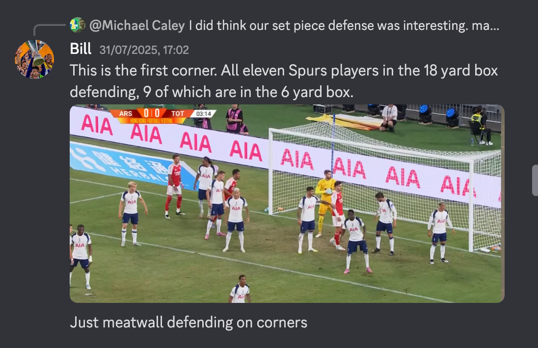 Fun story: this term was first coined on the Trivote Discord server (which you can join here!!! Unless you’re my dad, then no, you can’t). Bill described Tottenham’s preseason defensive corner shape as “meatwall defending”.