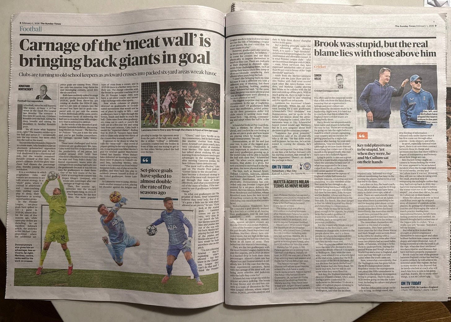 At some point pretty quickly afterwards, the term started being used to describe attacking corners seen more often at Chelsea and Arsenal. Caley published his study and deliberately avoided the term, but he did a podcast episode talking about the new approach as the “meat-wall”. Jonathan Norcroft of the Sunday Times was apparently listening and gave us this two-page spread.