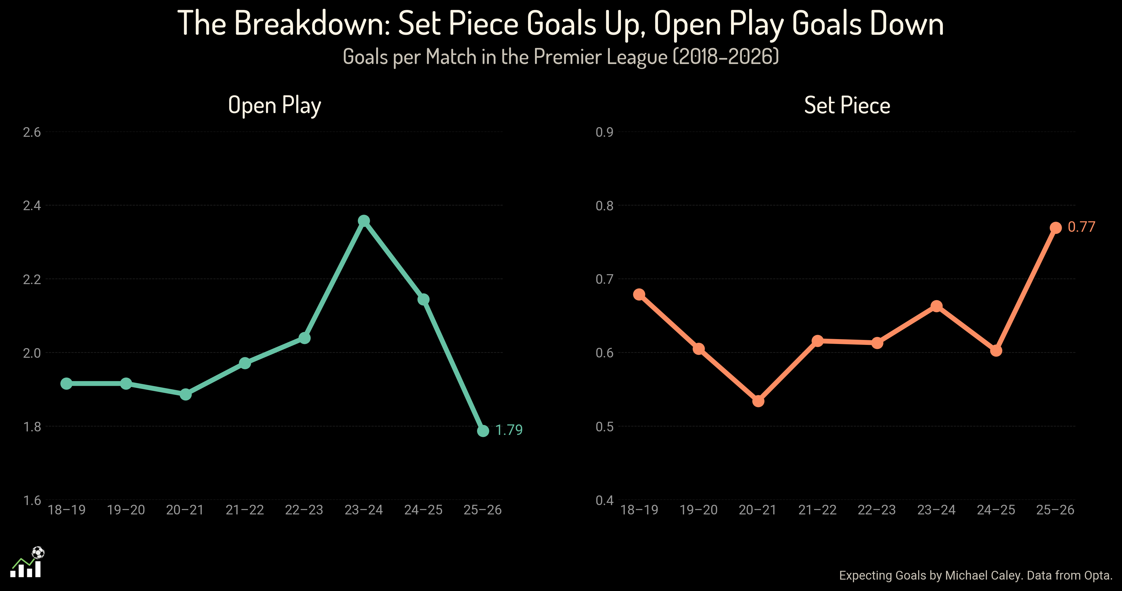 Ok, so one super nerdy team in Denmark won the league by scoring loads of set piece goals, and then everyone else copied. But what does that mean for open play, you might ask? Knutson says he always believed you could simply score more goals by adding good set pieces, while his colleague Marek Kwiatkowski wondered if it might cause trade-offs elsewhere, simply redistributing the goals and ultimately reducing the open play excitement. As of Knutson’s article in summer 2018, the goals just went up.