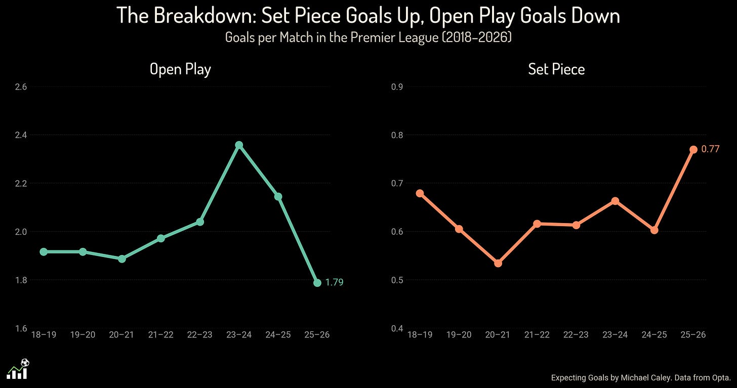 “Set piece goals per game have gone up by [0.2 goals per game], while overall scoring is up [0.5 goals per game]. This lends weight to the bigger pie hypothesis, and not merely different sized pieces.”