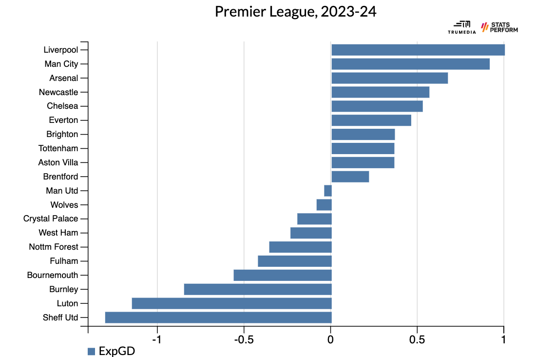 At the other end, Guglielmo Vicario has been outstanding so far, with FBRef’s post-shot model claiming he’s saved 3.7 goals above expected. He certainly seems a good goalkeeper, but this is really exceptional and should come down at least a little bit. Spurs will not outperform xG at both ends by this margin forever. ESPN writer (and friend of the newsletter) Ryan O’Hanlon wrote an article recently that included the xG difference per 90 minutes this season, “adjusted to account only for minutes when both teams had the same number of players on the field”, for every team. Spurs are solidly above average but don’t exactly look like title contenders.