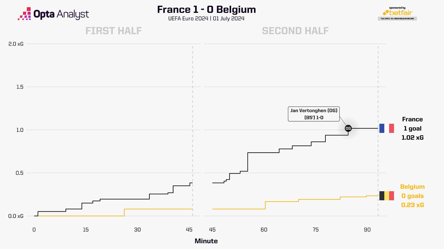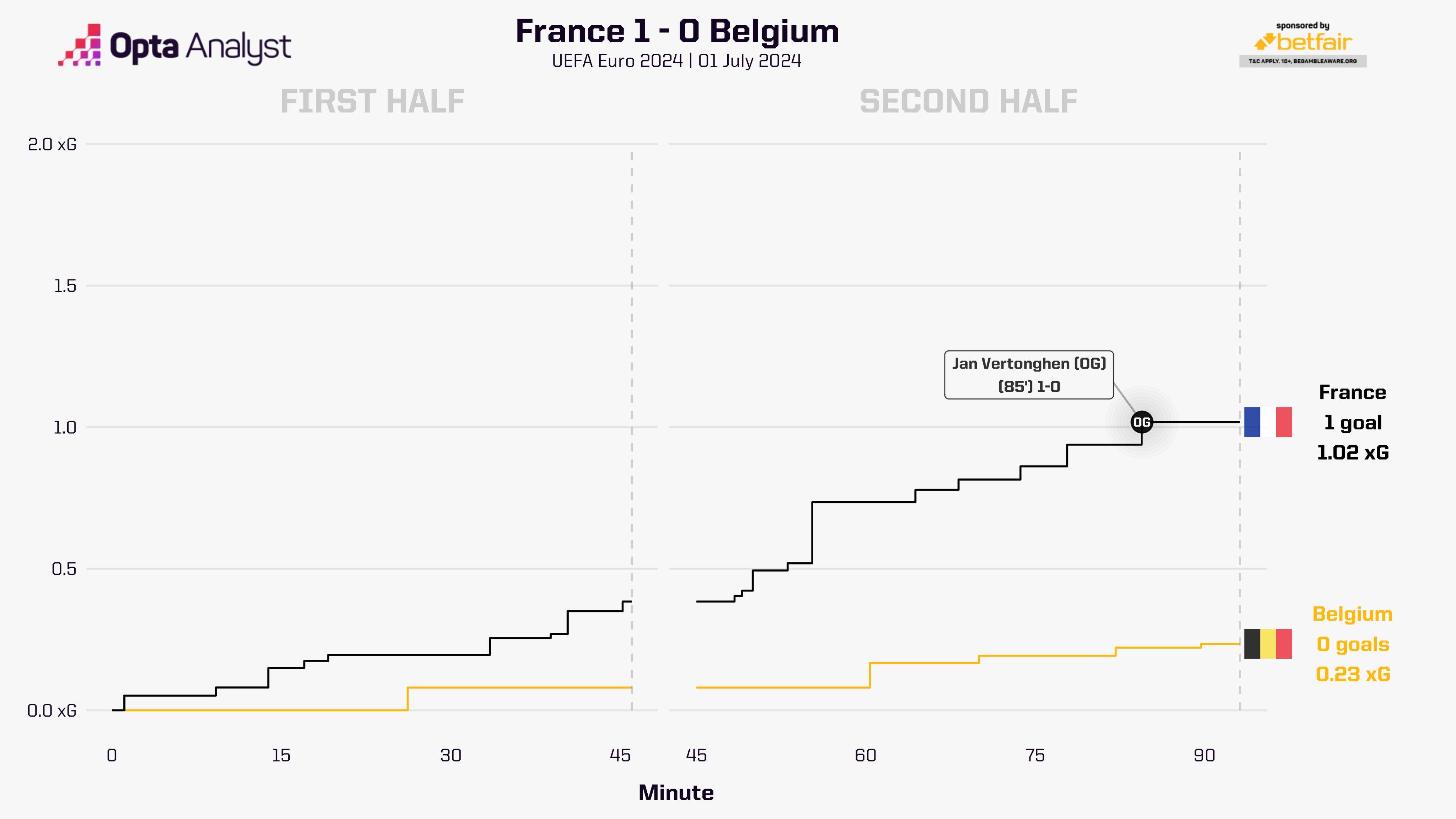 France took mediocre chance after mediocre chance throughout this game, and one of them finally went in! Randal Kolo Muani struck a pretty speculative shot from wide that took a huge deflection of Jan Vertonghen (who you probably assumed had retired a few years ago) to go in. So it goes. France were certainly the better side here, but that doesn’t mean they were particularly good.