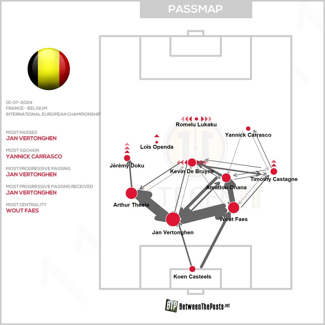 Domenico Tedesco also had decisions to make. Belgium played a kind of 4-4-2 that became a 3-4-3 in possession. The big call was moving Kevin De Bruyne into a deeper double pivot role next to Amadou Onana. It was not great. Attentive readers are currently saying “But Grace! You said to play De Bruyne deeper a few days ago and they did it!” And it’s true, I did say that. But come on, Domenico, this deep? My idea was to make the 4-2-3-1 more of a 4-3-3. Tedesco had him receiving the ball from the centre backs. Look at the passmap from Between the Posts to understand how not to progress the ball. They just couldn’t get it to any of their dangerous players.