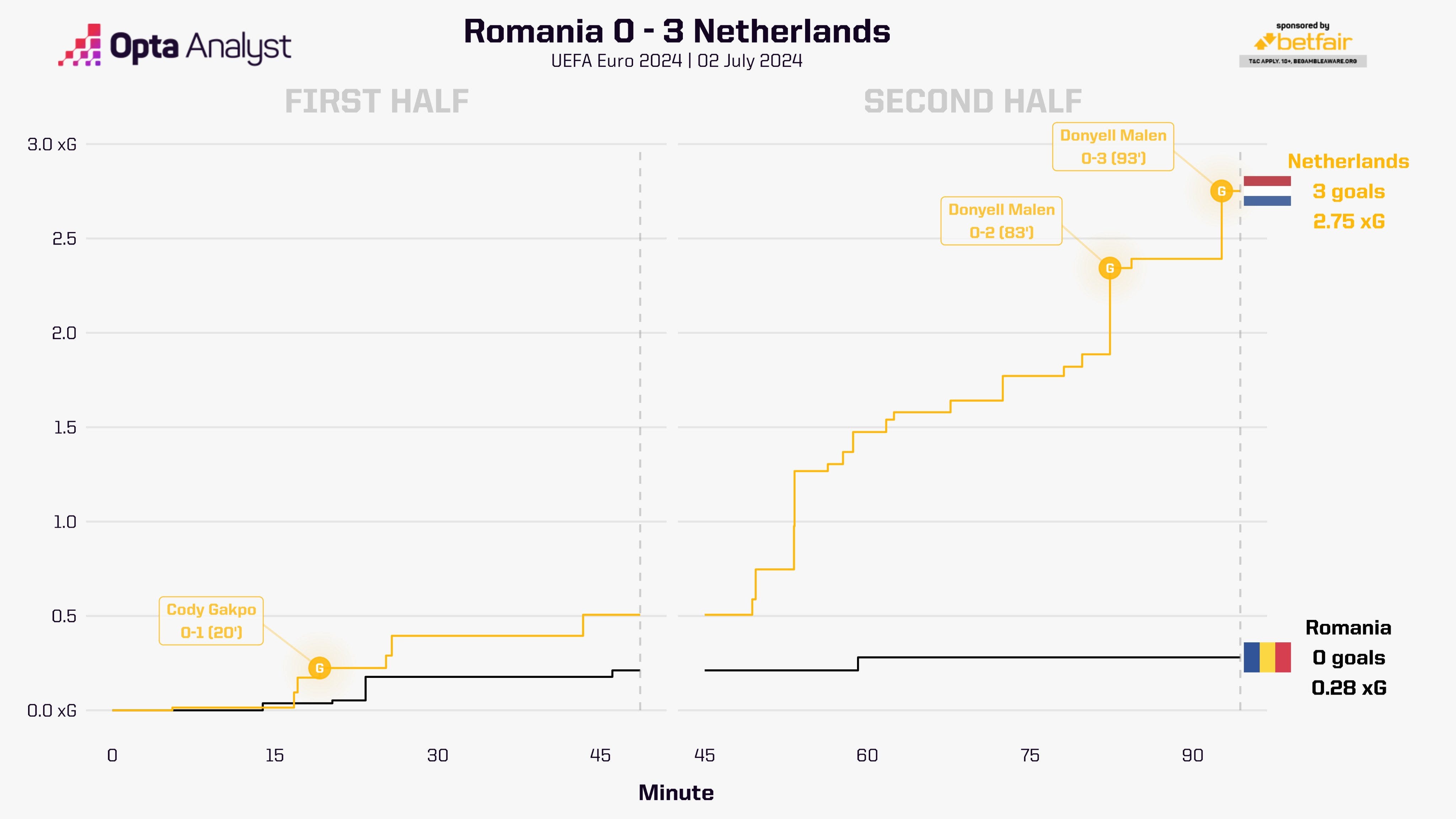It was a pretty slow start before Cody Gakpo scored a stunner to get the Netherlands ahead. I must admit, I’ve always been a Gakpo sceptic, but he’s made me question some things at this tournament. When he plays on the left, he’s a mismatch for just about any full back, standing at a reported 6’4 (1.93m) but still retaining a pretty low centre of gravity. He doesn’t have the acceleration to blitz past guys in the way Jürgen Klopp likes to use his wingers, but that’s not such a problem here. Ronald Koeman couldn’t get the best out of Sadio Mané at Southampton, so his demands from wingers are very different to Klopp’s requirements. He’s been scoring at over three times his xG in this tournament, which obviously isn’t going to last forever, but he does strike a ball cleanly. I still think he was a very poor fit for a Klopp team, but there’s a player in there, so we’ll have to see what Arne Slot makes of him.