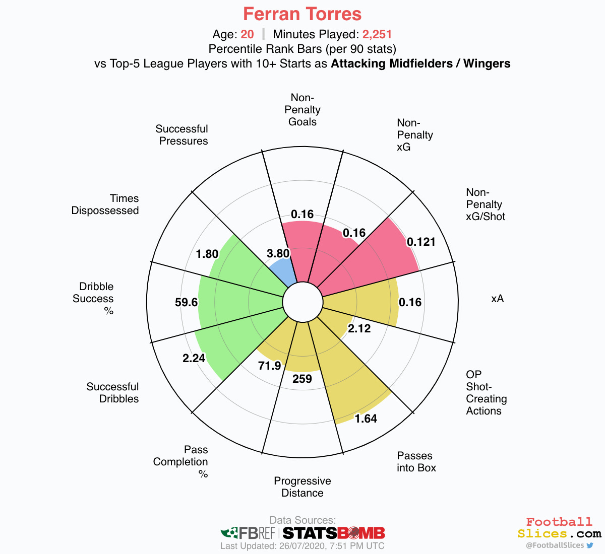Torres is solid at a lot of things without excelling at one single attribute. He doesn’t take a lot of shots, but the ones he does get tend to be good enough to make up for it. He’s a decent dribbler and acceptable creative passer. He looks to be someone Pep Guardiola could just plug in and expect a solid performance from, but I don’t think he’ll deliver more than that in the short term.