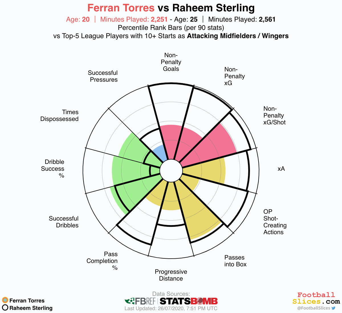 It’s obvious that the former Leicester City man is much more of a creative passer than Torres, who finds himself (3.60) sharing the burden with fellow Valencia winger Goncalo Guedes (3.62). Mahrez played more progressive passes per 90 (6.81) than his City wide berth rivals Bernardo Silva (4.96), Foden (3.70) and Raheem Sterling (3.29). He likes a shot (3.38 per 90) a lot more than Torres (1.32), but any given Mahrez shot is about 22% less likely to go in, so it takes him a lot of those strikes from range to score a goal. Mahrez, of course, is left footed, and that’s one of his biggest sources of value to City. Torres is very much a righty, so no use there.