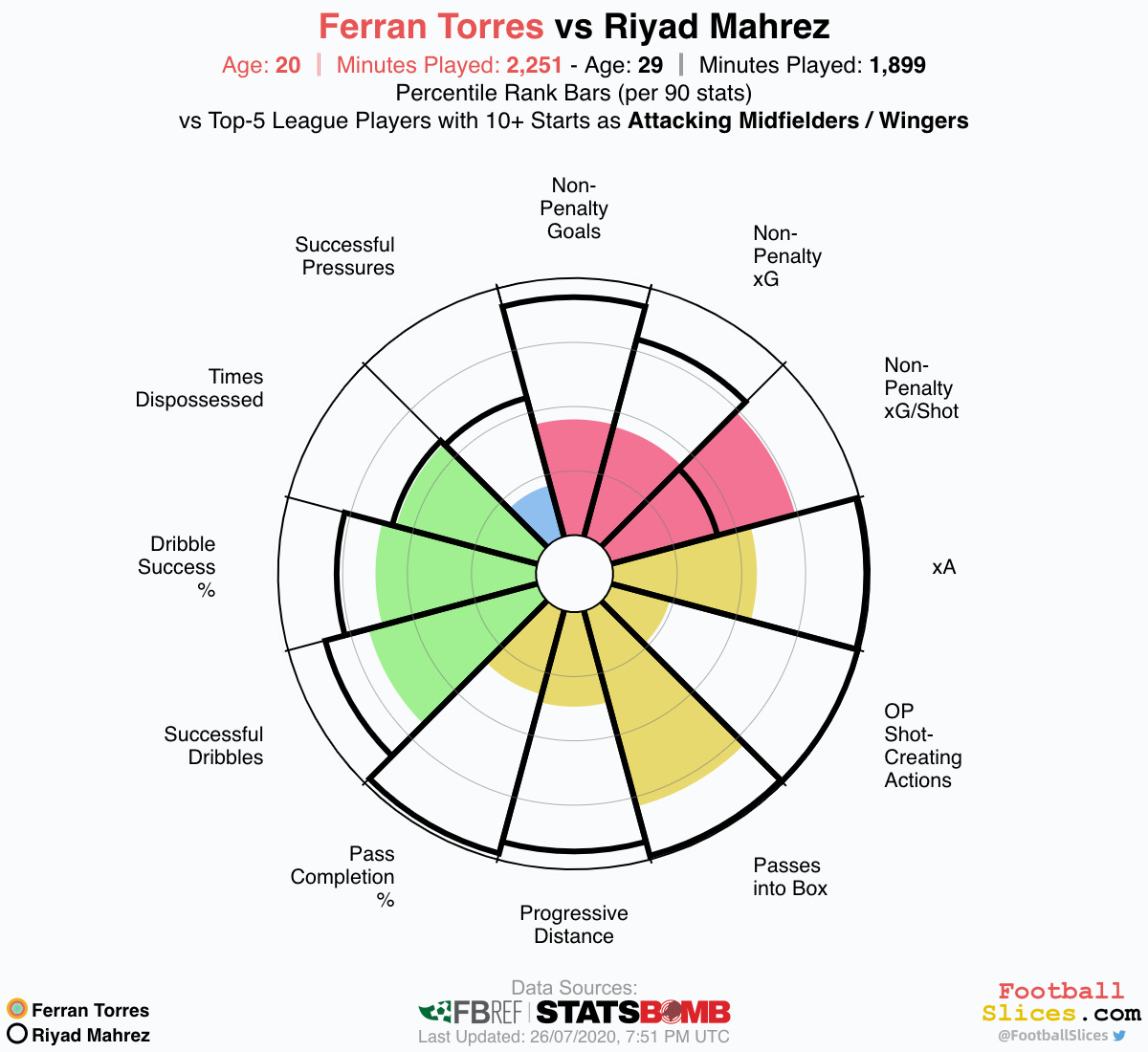 Guardiola recently said that Phil Foden was “not a winger-winger but he can play [out wide]”. Torres is a “winger-winger”. You can never be quite sure with Pep, but I’d imagine he’s someone who will play out wide, on either flank, pretty much exclusively. That marks him as different to the aforementioned Foden and Bernardo Silva. But what kind of winger is he? Let’s compare him to the two City standouts in the role. In both cases, we’re talking about older players at a much stronger team, so of course their numbers will be bigger overall, so just worry about the shape more than the quantities. First up is Riyad Mahrez.