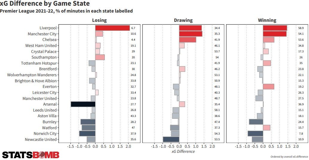 Well, the data says some things on that. When breaking down xG performance by game state (thanks to James Yorke, Director of Football at StatsBomb), we can see Arsenal have been a bit weird. They’re clearly the worst team in the league when behind (that’s the impact of those defeats to the Big Three), but pretty good when things are level, and league average when ahead.