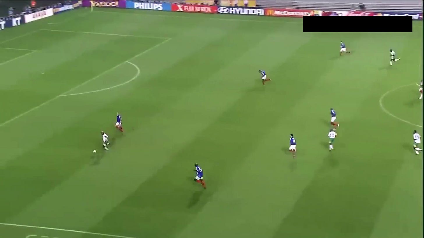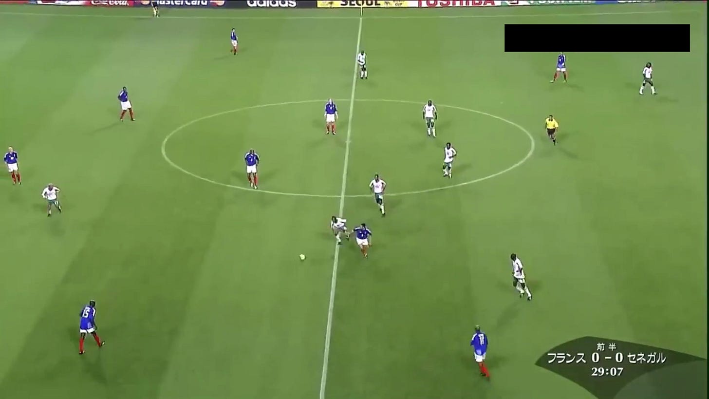 It shouldn’t have been this easy to frustrate France with a low block, but their lineup felt almost lab-built to suffer here. As wingers go, Henry and Wiltord weren’t really the type to get chalk on their boots and put crosses in. They wanted to run in behind. That made it easy for Senegal to stay deep and compact, leaving all the space out wide. Henry especially struggled with this, as the positions he took up were too narrow to cause any problems (understandable, considering how he played for Arsenal at the time). This meant both full backs had to push higher up the pitch to offer genuine width, making France easier to expose on the break. Honestly, Senegal weren’t brilliant at this. There were a few moments where they got undone by poor organisation, and France had a chance straight down the middle. It just really spoke to a lack of ideas that the French couldn’t make this happen more often.