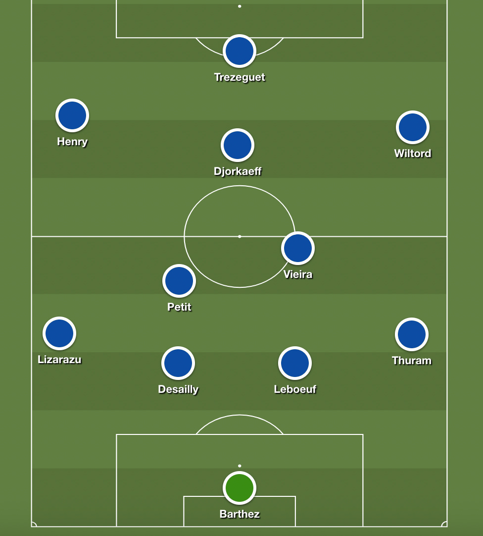 That could never happen with France because of Trezeguet, also 24, who was looking electric upfront for Juventus. Matching their ages, each had scored 24 goals in the Premier League and Serie A that season. It’s a very nice problem to have, but fitting them in together was always going to be a puzzle. For everything else they had, France rarely produced “proper” wingers in this era, relying more on converted forwards and creative midfielders. There wasn’t a quality left winger in this squad, which means Henry paid for his versatility. He started out wide while Trezeguet got the plum spot as the striker. The shape of the team was a pretty conventional 4-2-3-1 without too many complications.