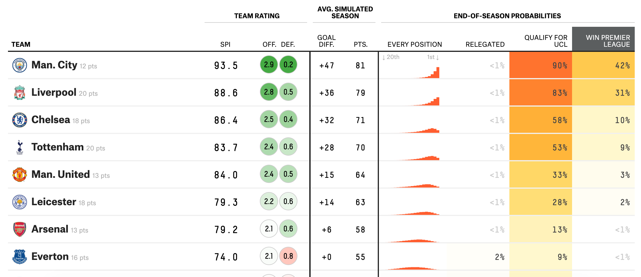 These three numbers are what feeds into the Soccer Power Index* (SPI). This then allows a sort of Elo or FIFA Rankings type model but with data about how well the teams played, rather than simply the result. Perform well against a very good team, even if you lose, and your SPI will go up. Play poorly against a weaker side, even if you win, and the SPI will go down. You get the picture. This is then what lets the model predict the result of every game and simulate an end of season table.