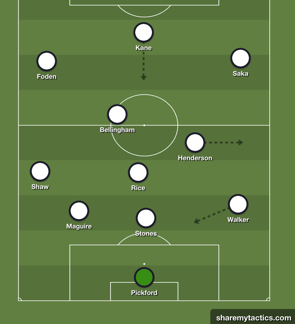 He could afford to do that because England’s shape really became a back three at times. Pep Guardiola says formations are little more than “telephone numbers” and this was a good example of that. While left back Luke Shaw would push up higher and take conventional full back positions, right back Kyle Walker would drop in along the centre backs and create a back three. Meanwhile, central midfielder Jordan Henderson would drift right at times to fill the space that a right wing-back might be expected to take up in a 3-4-3 system. England were trying to get the benefits of both systems here.