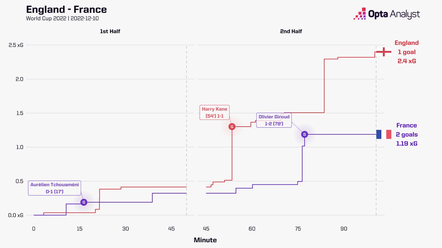 I’ve put in the race chart above, but this game isn’t a great one for xG. England clearly “won”, but that was almost entirely down to penalties. If you take those out, France have a very slight edge, but they were penalties. Everyone in the world saw that England had a chance to equalise with Kane’s second spot kick. This was a very contested game, with both teams putting together some good moments and finding it hard against an organised opponent. It was decided on Aurélien Tchouaméni scoring an absolute screamer in the first half and Kane missing a penalty in the second.