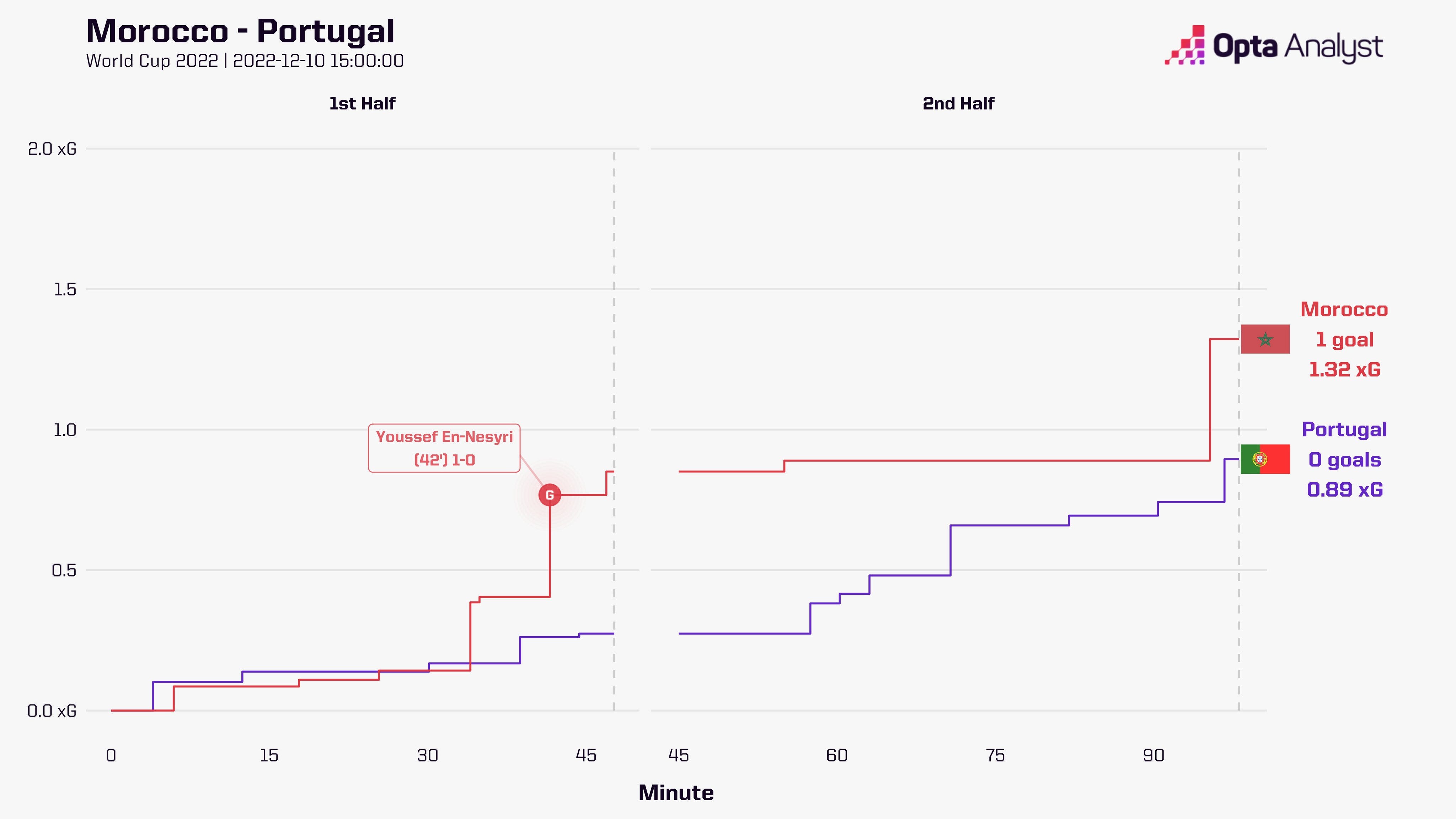 Hitting it fast to dynamic attackers is exactly what I would’ve suggested Portugal do, and it just didn’t work. After Portugal tried and failed to take the initiative, Morocco got ahead just before half time. Diogo Costa did a terrible job reading a cross and let Youssef En-Nesyri beat him to score. Morocco didn’t want half time to come after that, as the goal seemed to spook Portugal enough to let the Atlas Lions take control.