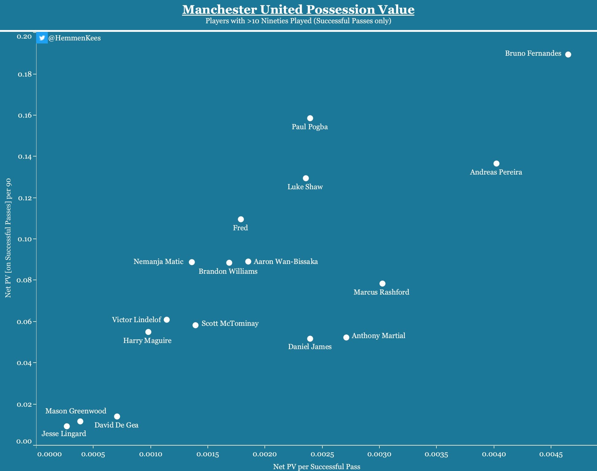 Let’s be fair and start with what the young England international is good at. 2.6 shots per 90 for an 18 year old wide man is impressive, and he has a real ability to shift the ball between his feet and create a pocket of space to get his shot away before someone has the chance to close him down. Whether defenders will wise up to that a bit now that he’s a “name” is anyone’s guess, but the talent is real. Anything done at Premier League level by an 18 year old is worthy of respect. But he’s not going to score all those goals unless he starts taking a lot more shots and from better positions. Models estimate about a 0.01% chance of him scoring so many from the shots he took. I know this is exactly what people talk about when they say stats ruin football, but the facts are still the facts. The expectation for him has to be as an occasional scorer rather than a regular one. And beyond that, he’s mostly a safe passing option who doesn’t create much danger for opponents. Take this possession value graph from Kees van Hemmen. Find Mason.